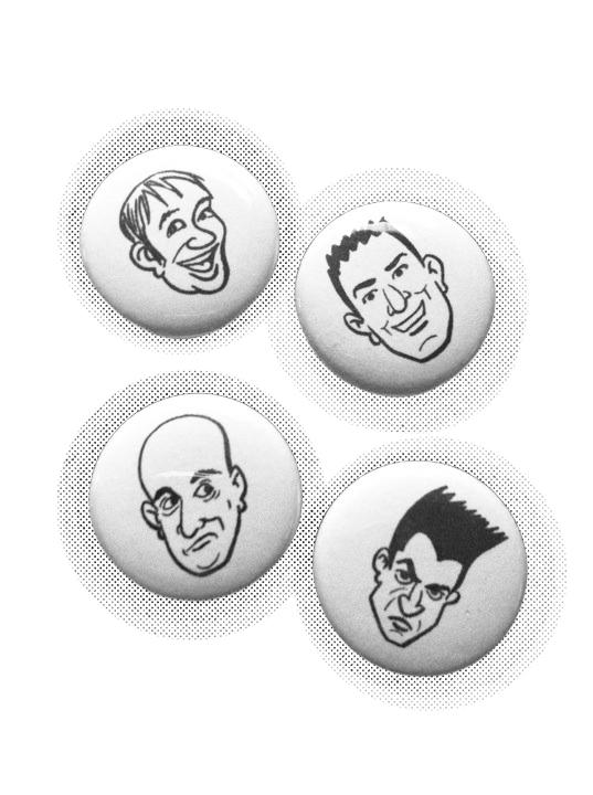 The Knockoffs, drawn and buttoned, clockwise from top: Bobby Jordan, former drummer “Big Tom” Amberson, Danny Reynoso and Tom Hutchison. PHOTO COURTESY OF THE KNOCKOFFS