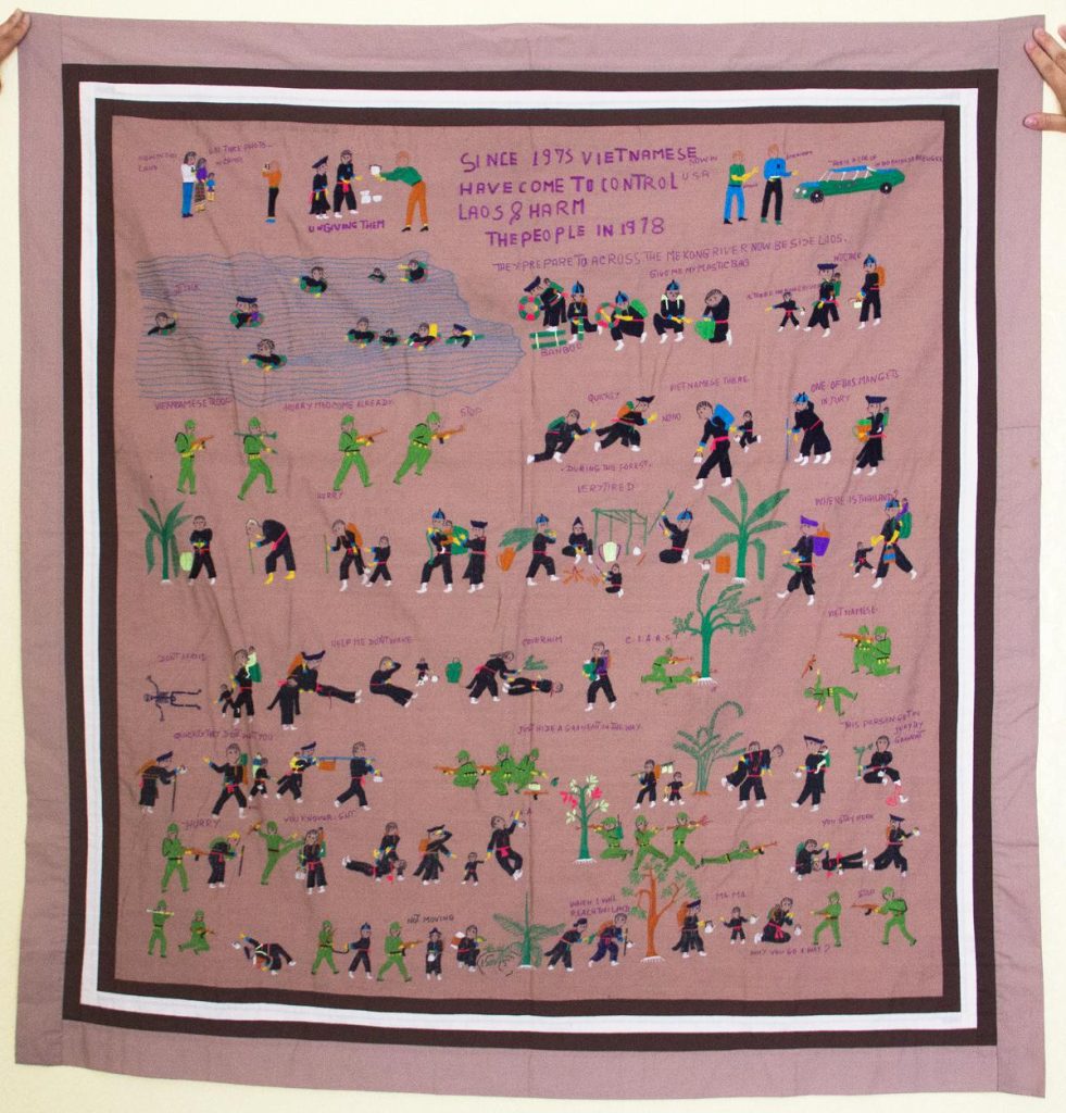 “Since 1975 Vietnamese have come to control Laos & harm the people,” Read embroidered lines at the top of one cloth displayed for the HmongStory 40, hung on a wall along with other story cloths, each with unique narratives. Celebrating four decades of Hmong refugee migration to the United States, the grassroots exhibit took place in Fresno, Merced and Sacramento, home to over 60,000 Hmong.