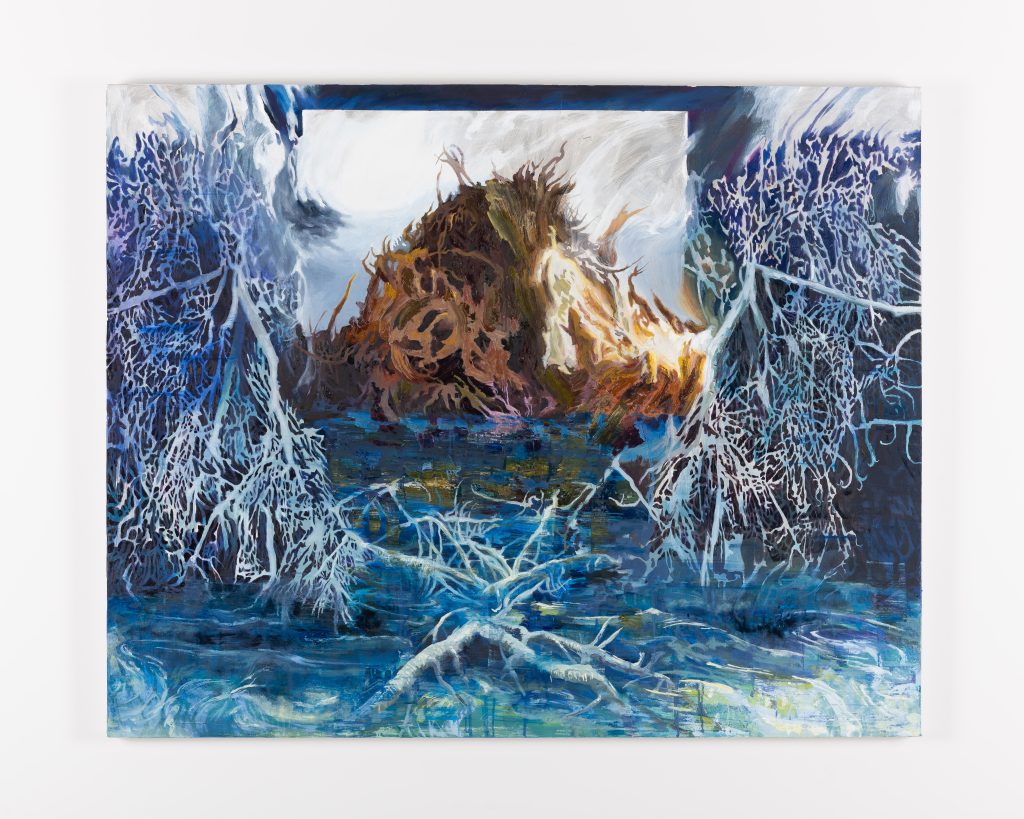 “So there’s this event and it’s really terrible, but then in the paintings there are these portals which have a hopeful new future,” she says. “How could I take something that has fallen apart, like a broken system, to be a catalyst for something rejuvenative.”