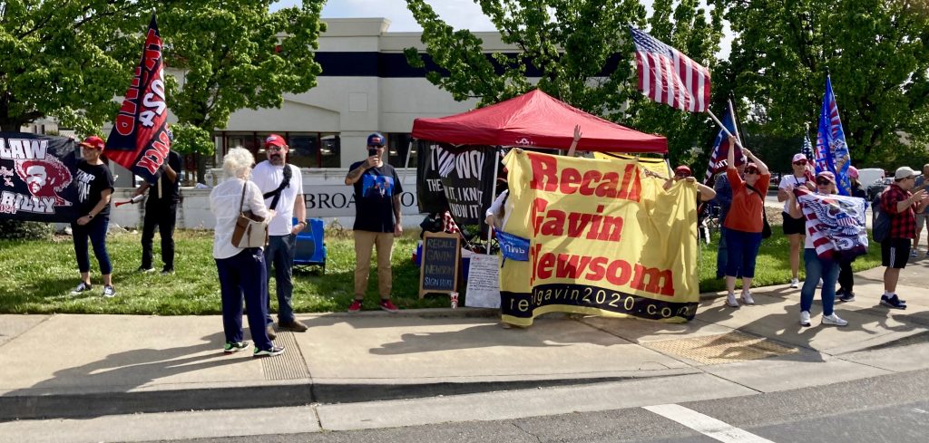 As the large crowd began to exit, a group of two dozen Trump supporters had been standing for hours at the southwest corner of East Bidwell Street and Scholar Way. They waved flags and solicited signatures for another attempt to recall Governor Newsom. Every few minutes large pick-up trucks carrying Trump flags blew off air horns while circling around the area.