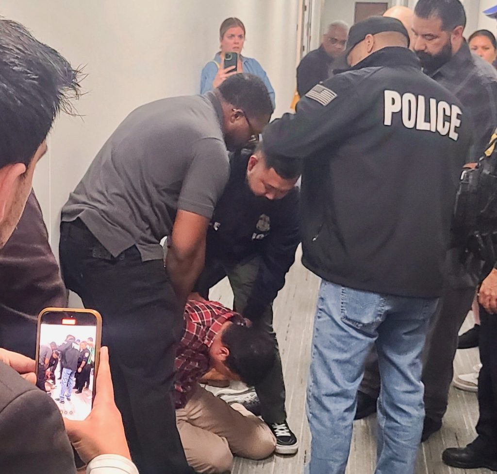 Another attorney in the hallway called for an ambulance, and eventually ICE backed away from the man. The attorney helped his client down the hallway to the elevator, holding the man’s arm over his shoulders to support his weight so that he could move away from the officers.
