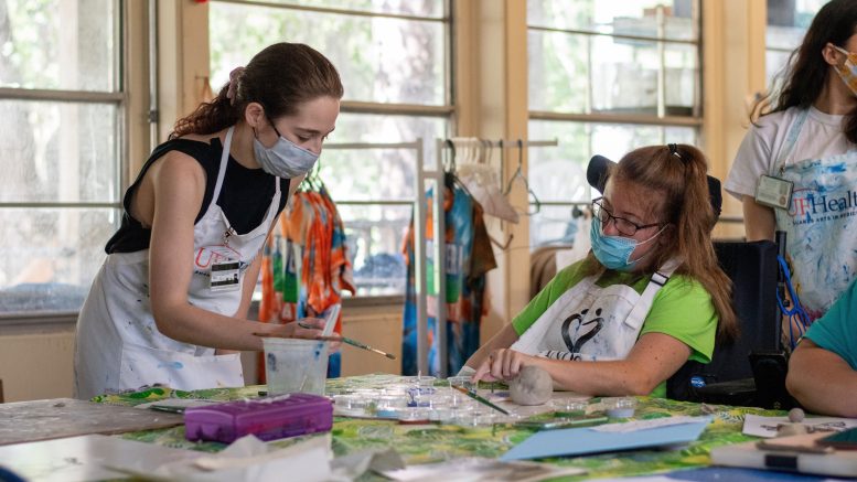A volunteer with the University of Florida Health’s Shands Arts in Medicine shows how art is used in the clinical setting. (Photo courtesy of University of Florida Health Shands Arts in Medicine)