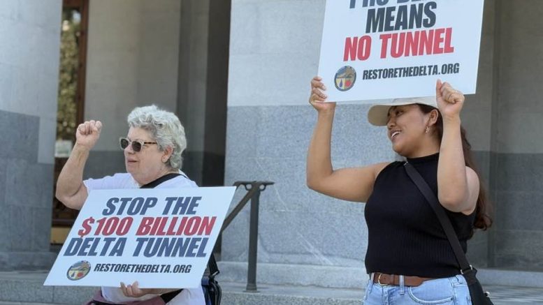 Tribal leaders, Delta farmers, conservationists and environmental justice advocates rallied for the imperiled Sacramento-San Joaquin River Delta on the west steps of the Capitol last Friday. As they held signs proclaiming “Pro Delta Means No Tunnel” and “Stop the $100 Billion Delta Tunnel,” they called on lawmakers to defend the state’s water rights, environmental protections and public due process from Gov. Gavin Newsom and legislative leaders’ attempts to bypass all of those via new trailer bills benefiting Big Ag and water agencies in Southern California.