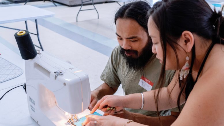 Pachia Lucy Vang guides Kai Vang, one of the participants of the Paj Ntaub or flower cloth textile workshop, to use the sewing machine at the HOPE Center in Sacramento on Aug. 23, 2025. (Photo by Andri Tambunan)