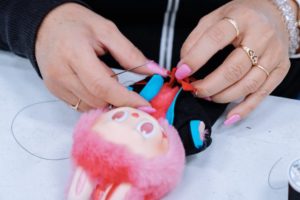 A participant of the Paj Ntaub or flower cloth textile workshop hosted by Culture Through Cloth sews a custom traditional Hmong outfit for the popular Labubu dolls at the HOPE Center in Sacramento on Aug. 23. (Photo by Andri Tambunan)