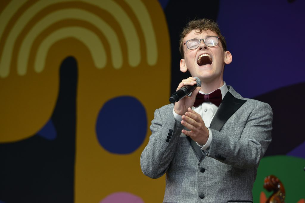 Declan Cashman takes the mic at the Monterey Jazz Festival. Photograph by Michael Solomon