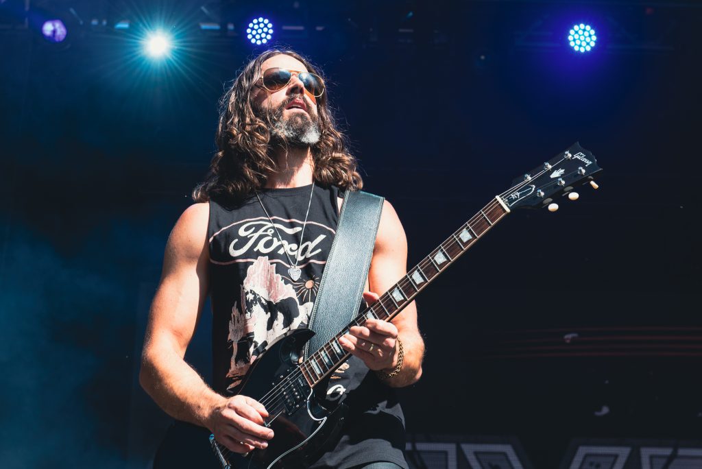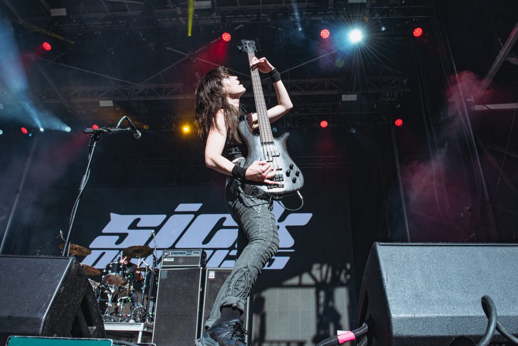 Emma Anzai of Sick Puppies tearing it up on stage. Photograph by Sugarwolf