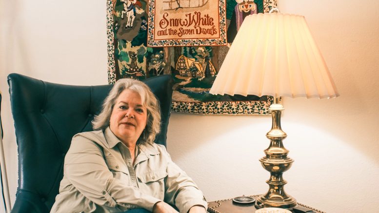Art educator Lois Buchter in her Folsom home on Oct. 29, 2025. Buchter wove the Snow White tapestry she sits in front of by hand. (Photo by Ruth Finch)