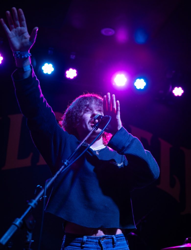 Hotel Mira lead singer Charlie Kerr engages the audience at Goldfield Trading Post in Midtown Sacramento on Wednesday, Nov. 12. (Photo by Xavier Figueroa)
