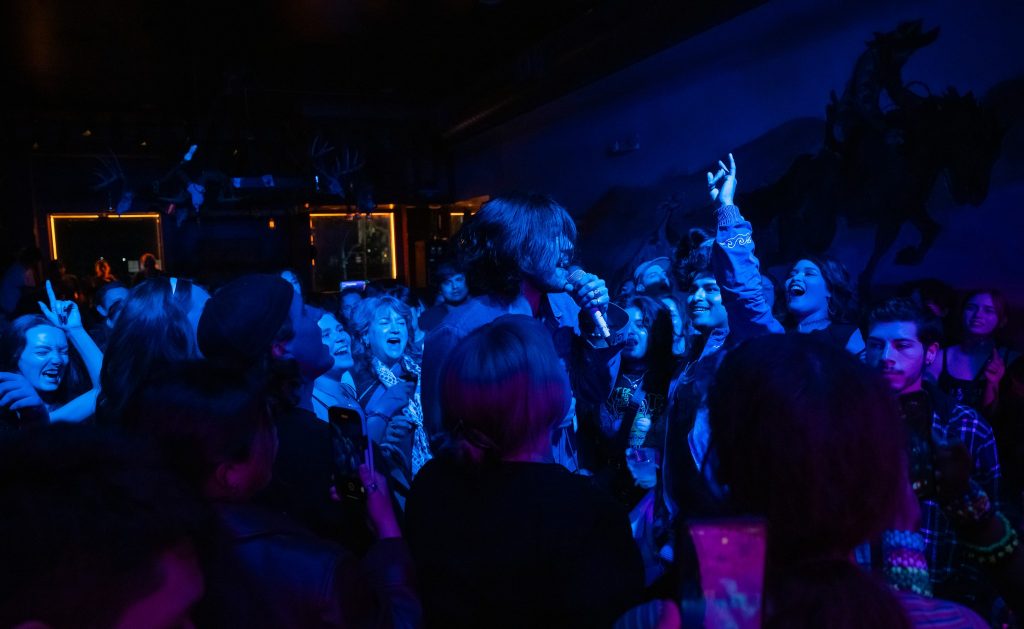 Hotel Mira lead singer Charlie Kerr performs in the middle of the crowd at Goldfield Trading Post in Midtown Sacramento on Wednesday, Nov. 12. (Photo by Xavier Figueroa)