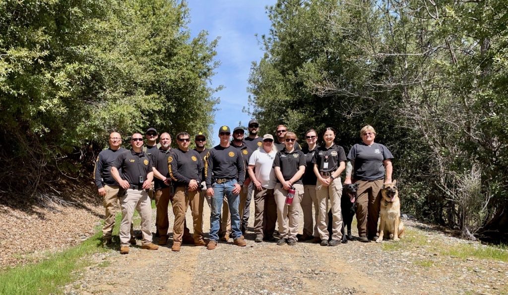 The Calaveras Cold Case Task Force, along with a specialized canine search dog, work out in Wilseyville where the 1984-85 mass killing took place. Photo courtesy of the Calaveras Sheriff’s Office.