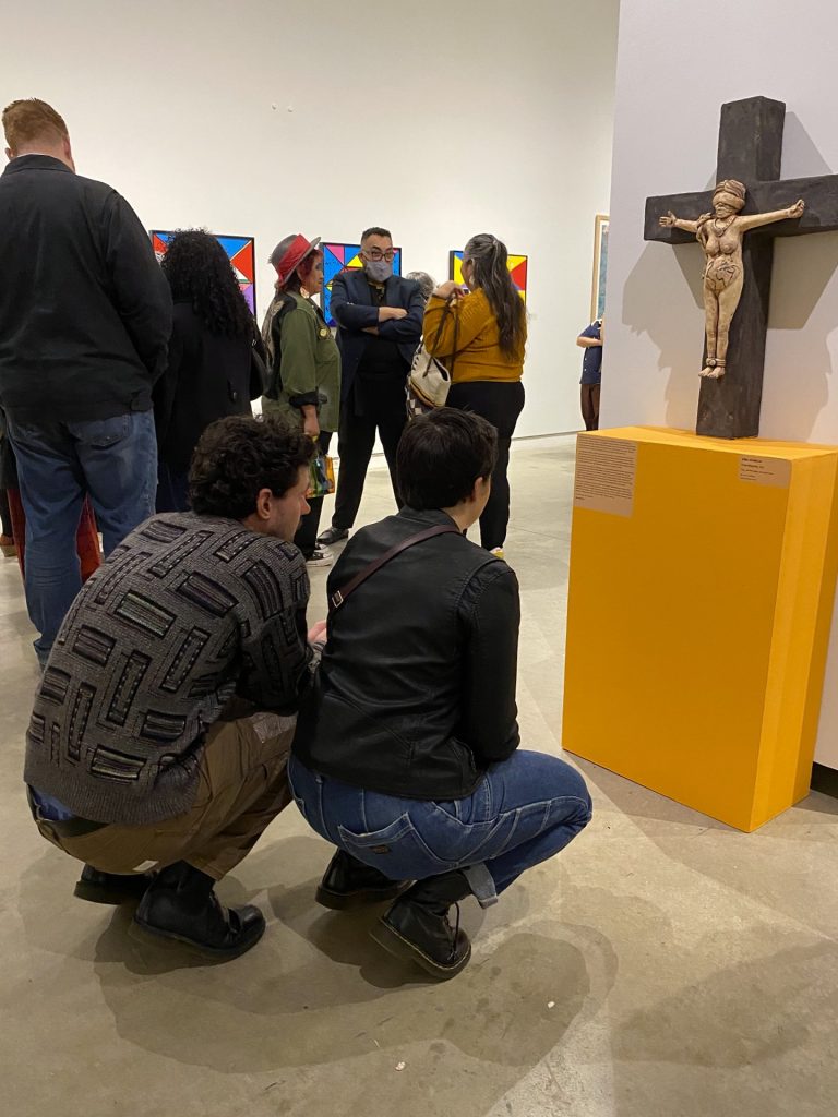 A sculpture by queer Chicanx artist Gina Aparicio, an LA native now living in Georgia, features a crucified female figure with Earth for a womb. According to the artist’s statement, this piece “speaks to women being the givers of life, yet silenced, unseen and punished out of fear of them exercising their true power.”